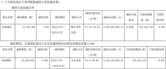 另外,合成国际通过大宗交易方式减持公司股份2520.06万股,减持比例达到股份总数0.80%,减持总金额为20.33亿元。