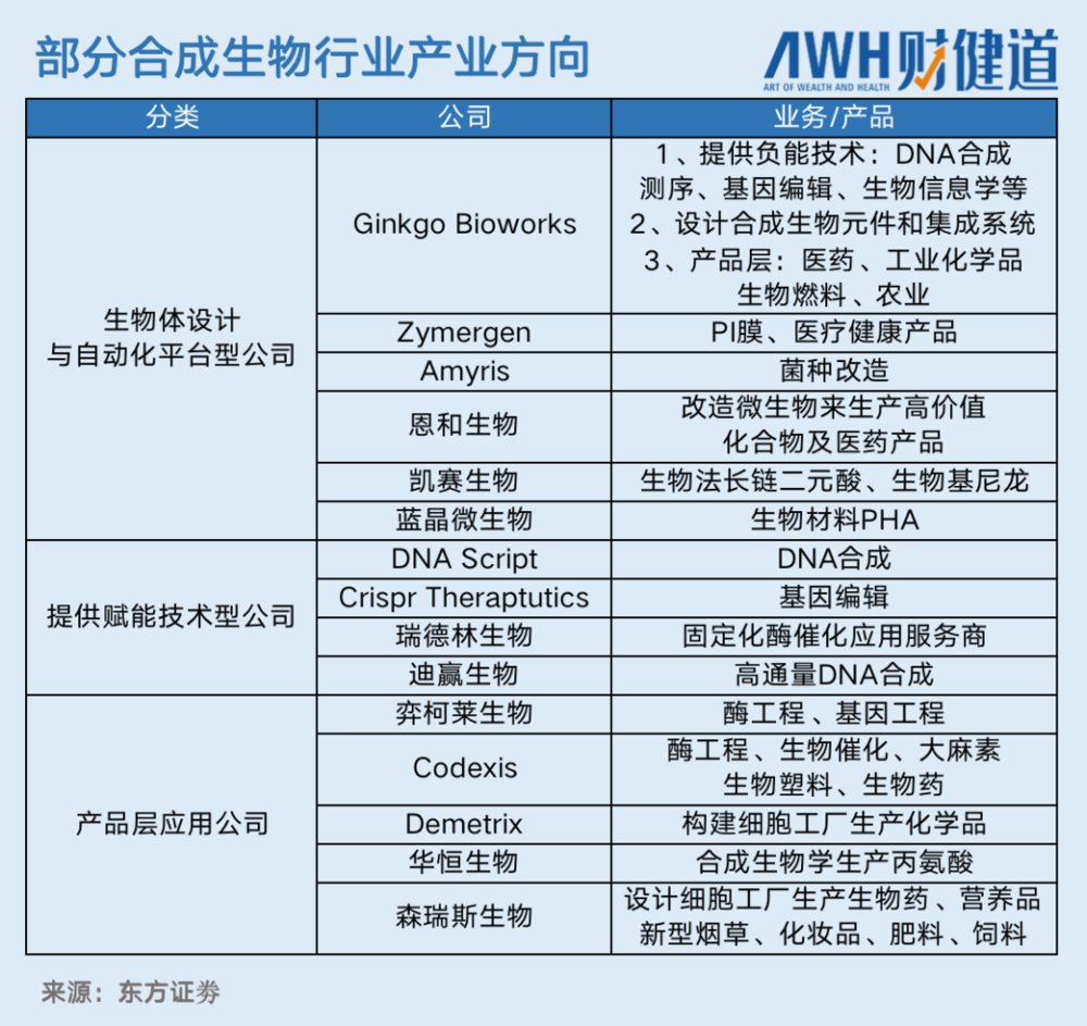 各路资本涌入之后,正在不断把“盘子”做大,许多或古老、或新兴的技术均被划为合成生物学之列,涉及的领域、方向十分广泛,低可做尼龙,高可改良药品,几乎渗透到生产生活的各个领域。